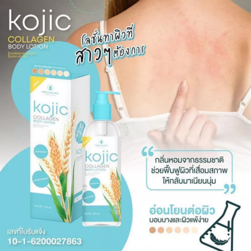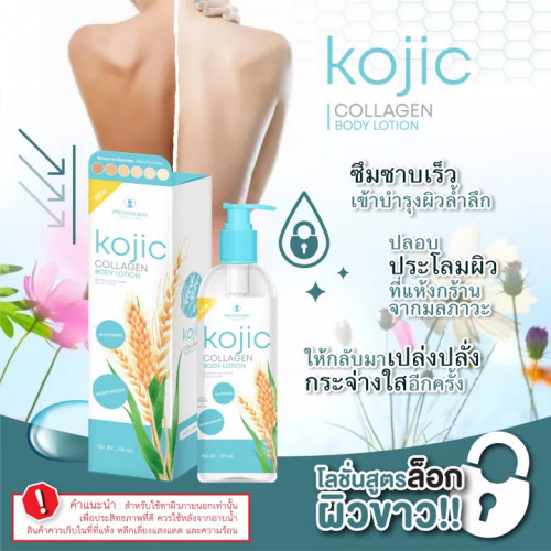• KOJIC COLLAGEN BODY LOTION by Precious Skin Thailand 230mlKojic Collagen Body Lotion 1. Lighten dark spots 2. Eliminate dull skin 3. Smoothen skin tone 4. Healthy skin5. The texture of the lotion was created as fast absorbed into your skinPrecious Skin Thailand