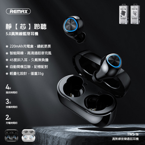 Brand:REMAX Model:RB-T16 Colour:black/White Material:ABS Communication:Wireless Wireless Type:bluetooth bluetooth version:5.0 Transmission distance:10m Operating Voltage:3.7V Horn impedance:16Ω Speaker power:5mW Battery Capacity:40MAH Vocalism Principle:Other Control Button:Yes Volume Control:Yes Function:For Mobile Phone Sensitivity:110±5dB Frequency Response Range:20-20000Hz Waterproof:Yes Support Memory Card:No With Microphone:Yes Charging Time:1H Music Time:4H Talk Time:4H Standby Time:50H Weight:35g Dimension:63*31*32mm