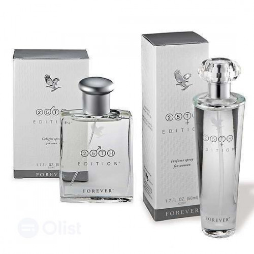 Allure your senses with the fresh and aromatic fragrances of 25TH Edition® Cologne Spray for Men and 25TH Edition® Perfume Spray for Women. Expertly blended and created espe-cially for Forever Living, each scent captures its essence in a subtly pleasing elixir. 25TH Edition® for Men is a fluid, aromatic fougère fragrance with a sensuous masculine blend of fruity, herbaceous and woody notes that are forever fresh and long lasting. The topnote blends aromatic notes of crushed basil and Mediterranean lavender with a refreshing combination of iced pineapple and Calabrian bergamot. The slightly fruity aromatic impres-sion continues into the heart, where geranium and tea leaves are accented by Granny Smith apple. The fragrance evolves to reveal a mas-culine base of oakmoss, Mysore sandalwood,