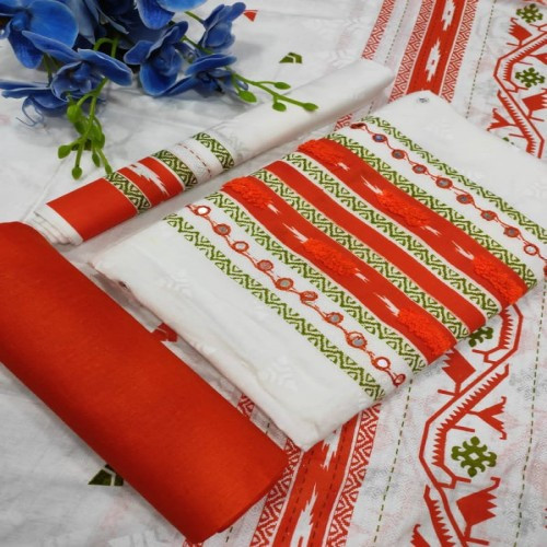 সুতি জামদানি থ্রি পিস কামিজ-পিওর কটন, স্কিন প্রিন্ট ,,গলায় এবং পুরো বডিতে ছোট,ছোট ডলারের কাজ করা আছে।। হাতার কাপড় আলাদা দেওয়া আছে।। সালোয়ার:-পিওর কটন। ওড়না:-পিওর কটন,স্কিন প্রিন্ট.